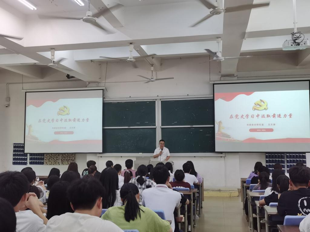 王文潮以清代龚自珍的“欲知大道,必先为史。灭人之国,必先去其史。”为切入点,把党史故事贯穿其中,从不忘“来时路”熔铸信仰之魂、走好“脚下路”厚补精神之钙和坚定“未来路”敢于担当作为等三个方面与师生们一起交流思考,引导师生在党史中汲取精神力量,把党史学习教育成果转化为干事创业的激情和学好本领的动力。