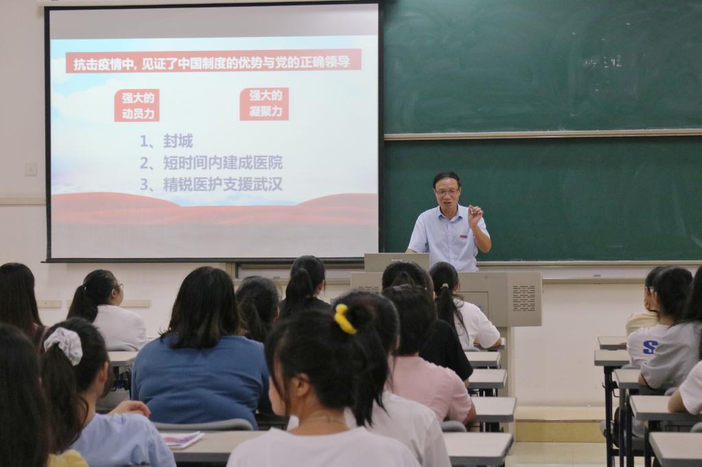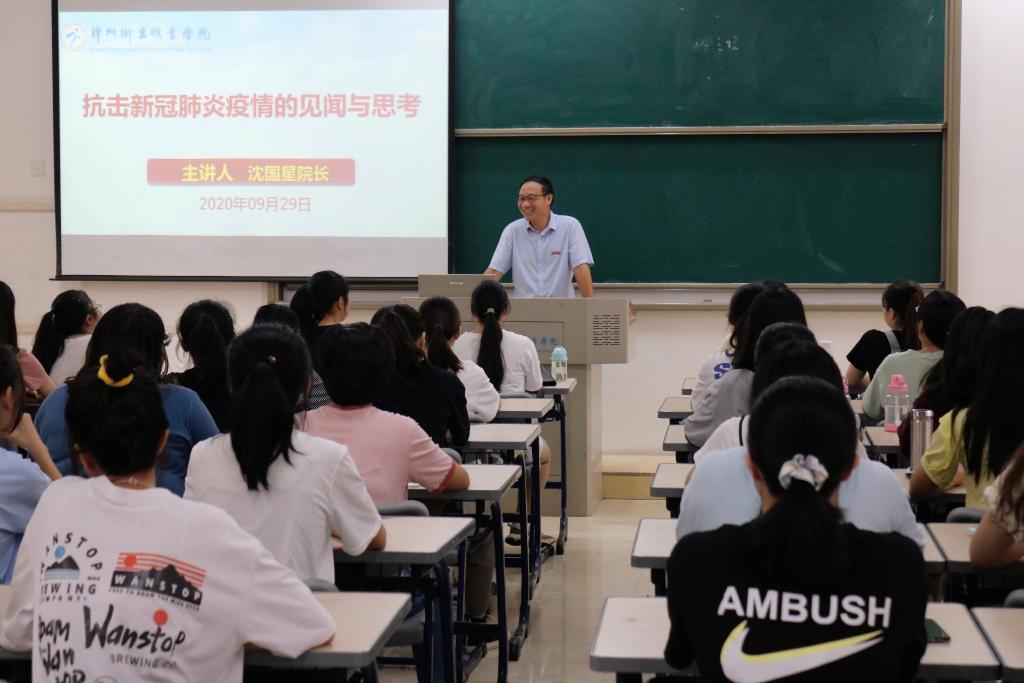 9月29日下午,沈国星走进励志楼304教室,为2019级护理专业学生讲授主题为“抗击新冠肺炎疫情的见闻与思考”思政课。