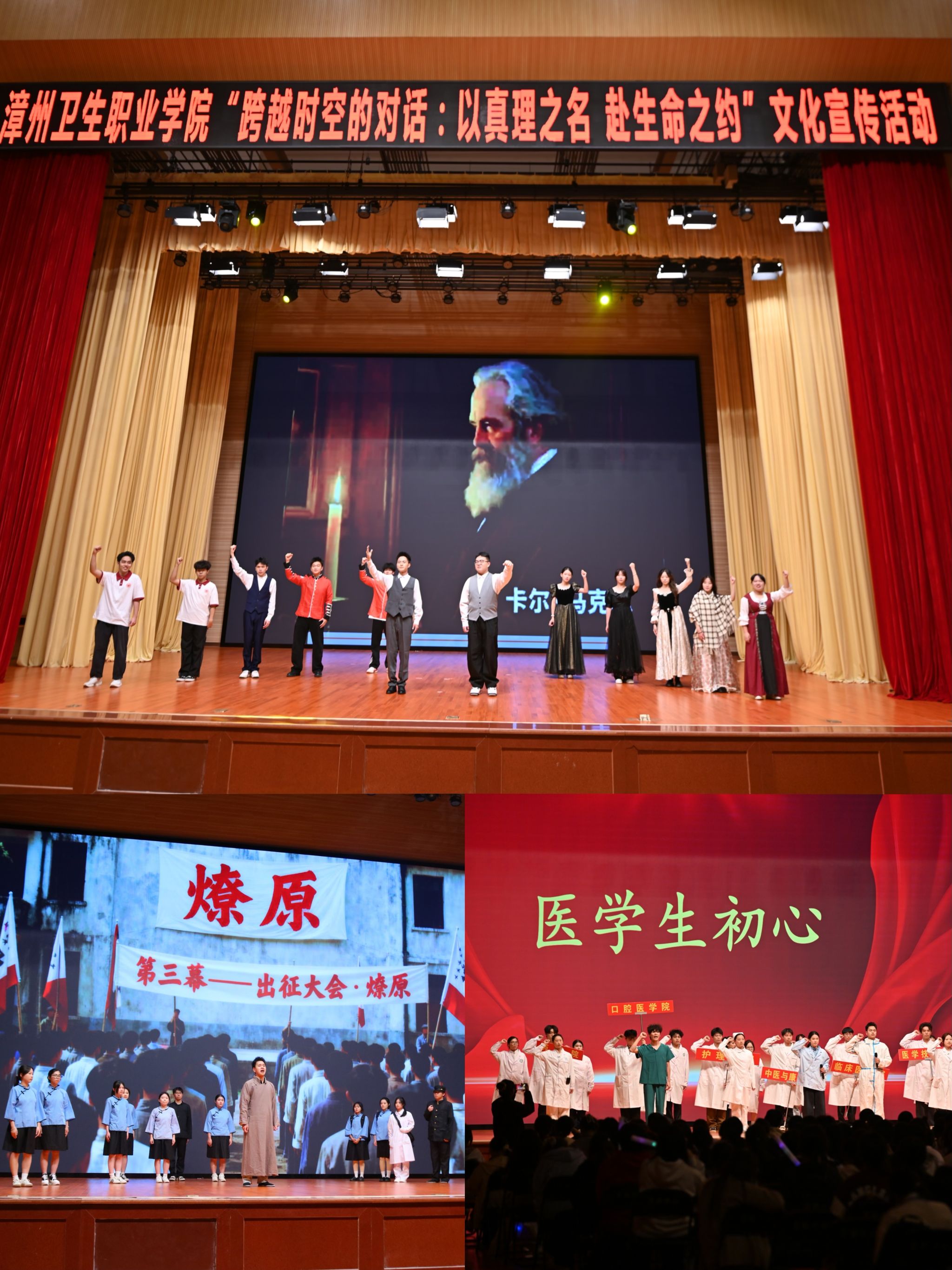 作为理论学习的先锋力量,两大社团深度参与了活动的整体策划与实施。从前期构思“青年—中年—不朽”三大叙事篇章,到精心编排情景剧《马克思》《初心接力》、话剧《烽火联大》、朗诵《青春中国》、歌曲《如愿》等节目,社团成员将理论学习成果转化为生动的艺术实践。情景剧中青年马克思追寻真理的执着目光,话剧中联大师生“刚毅坚卓”的铮铮风骨,朗诵中新时代青年的铿锵誓言,都凝聚着社团成员对真理的深刻理解与时代诠释。立足医学院校特色,活动着力推动医学人文与思政教育的深度融合。从致敬逆行者的动人歌声,到展现红色医脉传承的深情演绎,再到诠释医者初心的精彩剧目,无不彰显“生命至上”的价值追求。