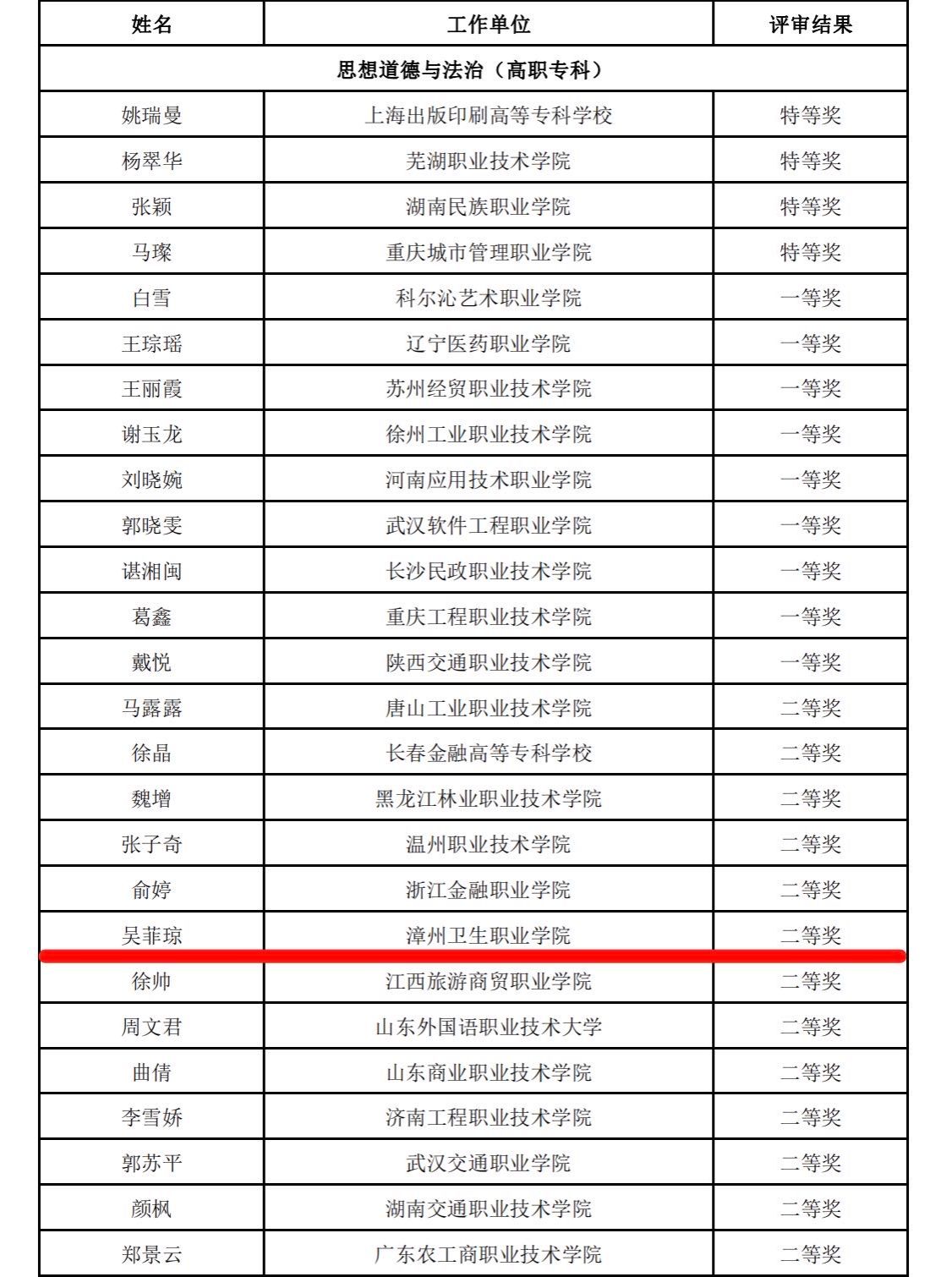 近日,教育部办公厅公示第三届全国高校思想政治论课教学展示活动“教学竞赛单元”评选结果,我校马克思主义学院教师吴菲琼荣获“思想道德与法治(高职专科)”二等奖。