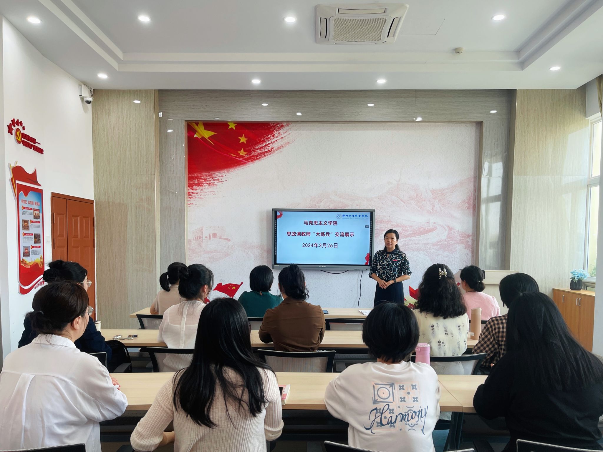 为深入学习宣传贯彻党的二十大精神、贯彻落实习近平总书记在中央政治局第五次集体学习时的重要讲话精神和在学校思想政治理论课教师座谈会上的重要讲话精神,3月26日下午,我院组织全体思政课教师在党建活动中心开展思政课教师“大练兵”交流展示活动,活动由马克思主义学院院长洪玉兰主持。