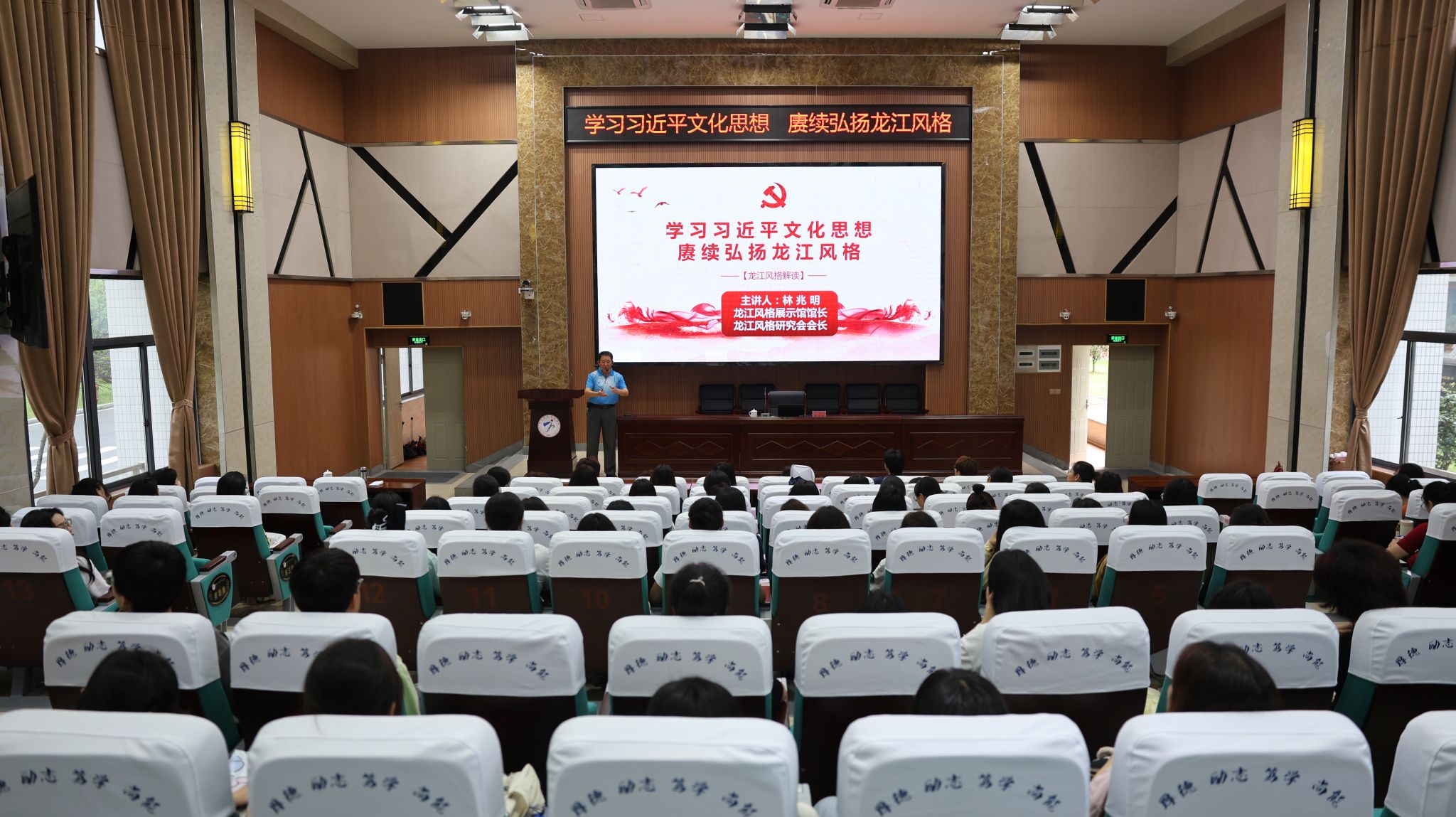 为深入学习贯彻习近平文化思想,进一步弘扬新时代“龙江风格”,自觉肩负起新时代新的文化使命。4月23日,我院在学术报告厅开展以“学习习近平文化思想 赓续弘扬龙江风格”为主题的道德讲堂活动。此次活动由龙江风格展示馆馆长、龙江风格研究会会长林兆明主讲,思政课教师、读书社以及青马学社学生现场聆听讲座。