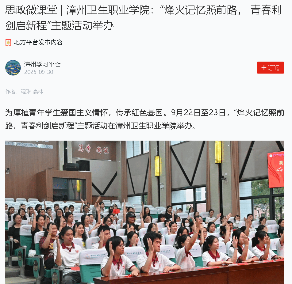 学习强国、闽南日报:思政微课堂|漳州卫生职业学院:“烽火记忆照前路,青春利剑启新程”主题活动举办
