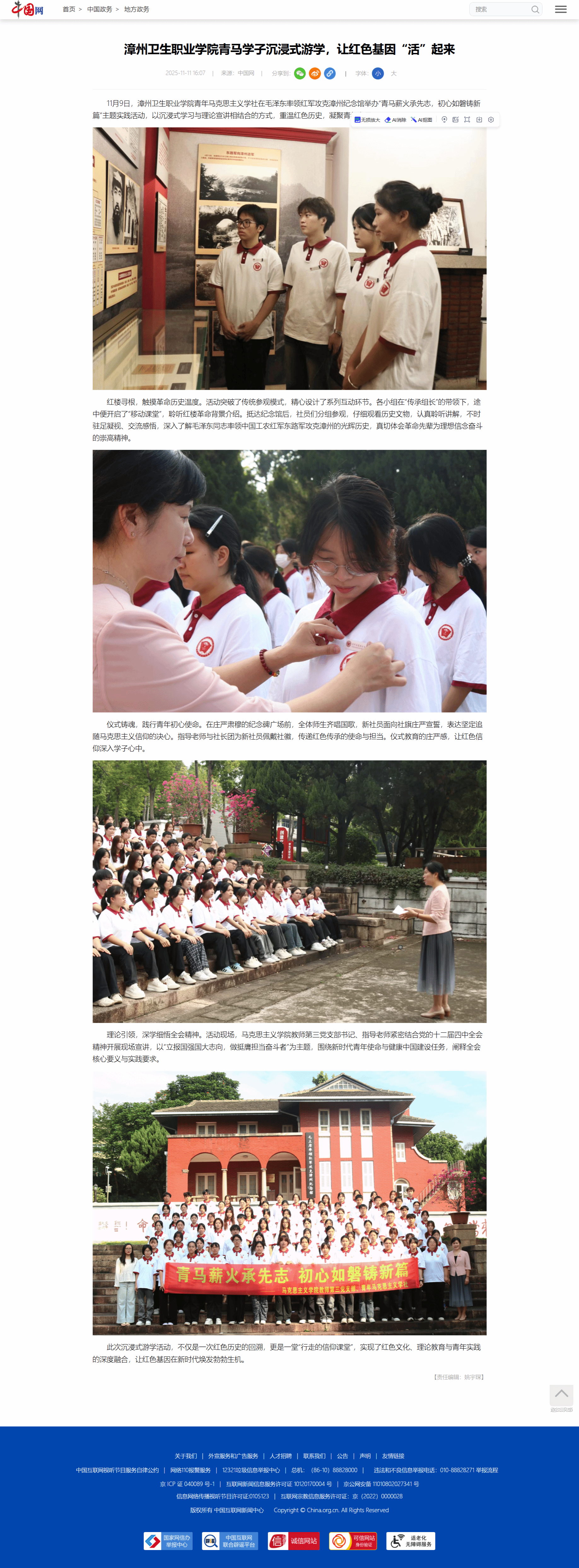 中国网、东南网:漳州卫生职业学院青马学子沉浸式游学,让红色基因“活”起来