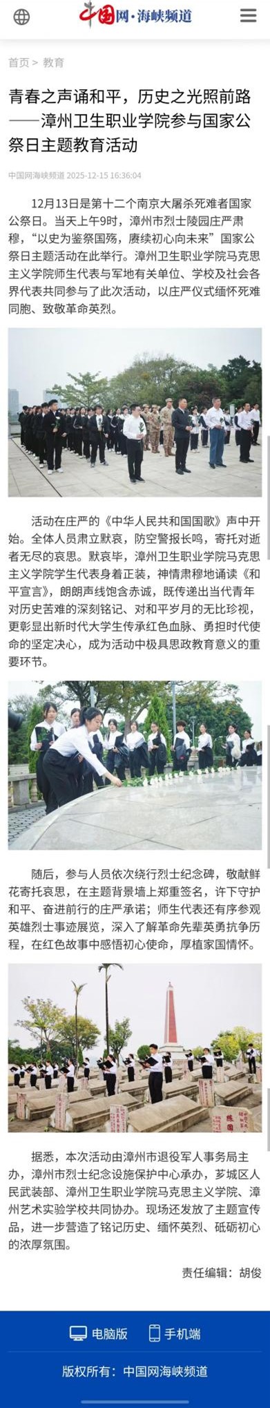 中国网海峡频道:青春之声诵和平,历史之光照前路——漳州卫生职业学院参与国家公祭日主题教育活动