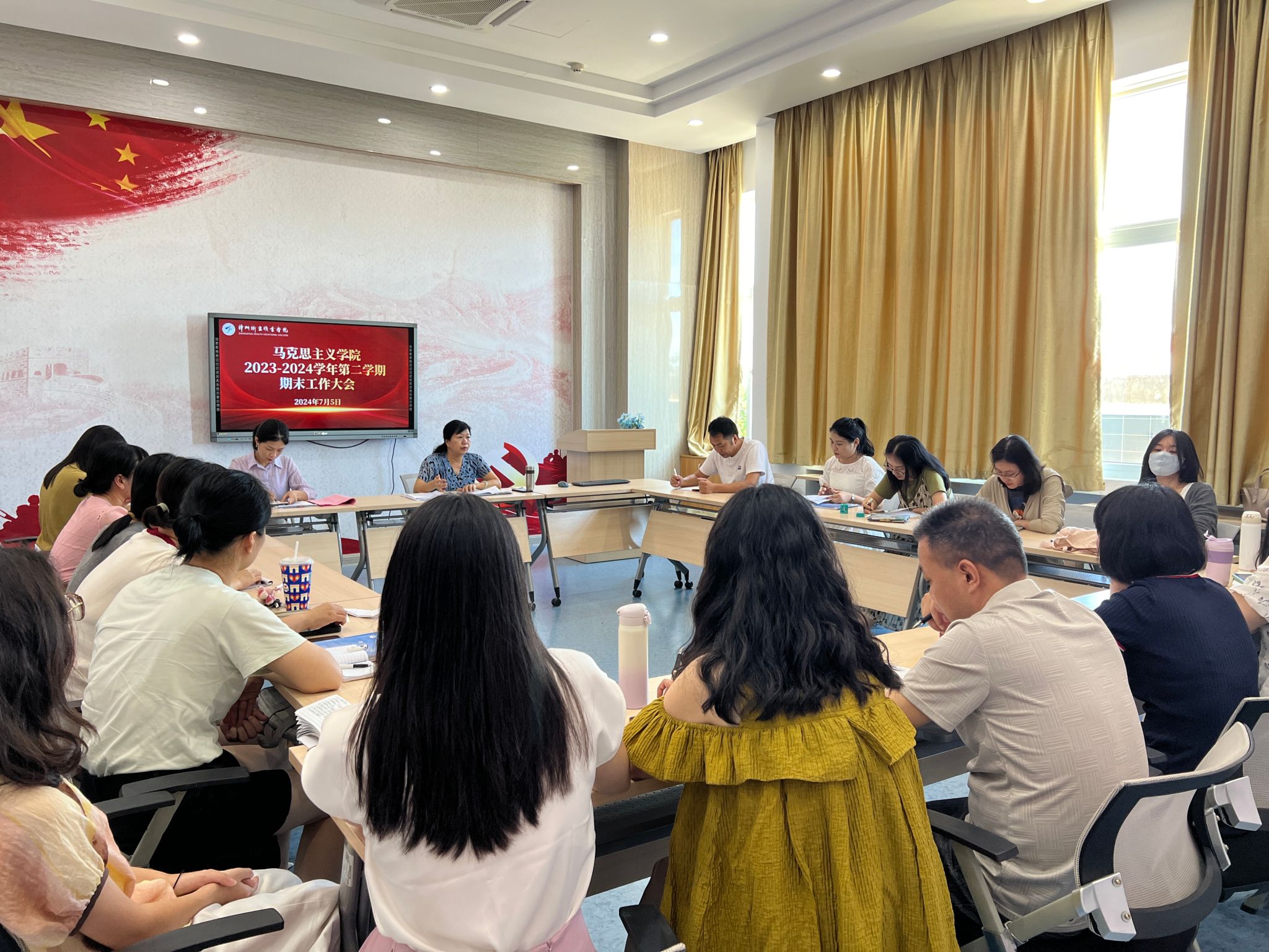 7月5日,我院在党建活动室召开2023-2024学年第二学期期末工作总结大会。会议由院长洪玉兰主持,学院全体教师参加。