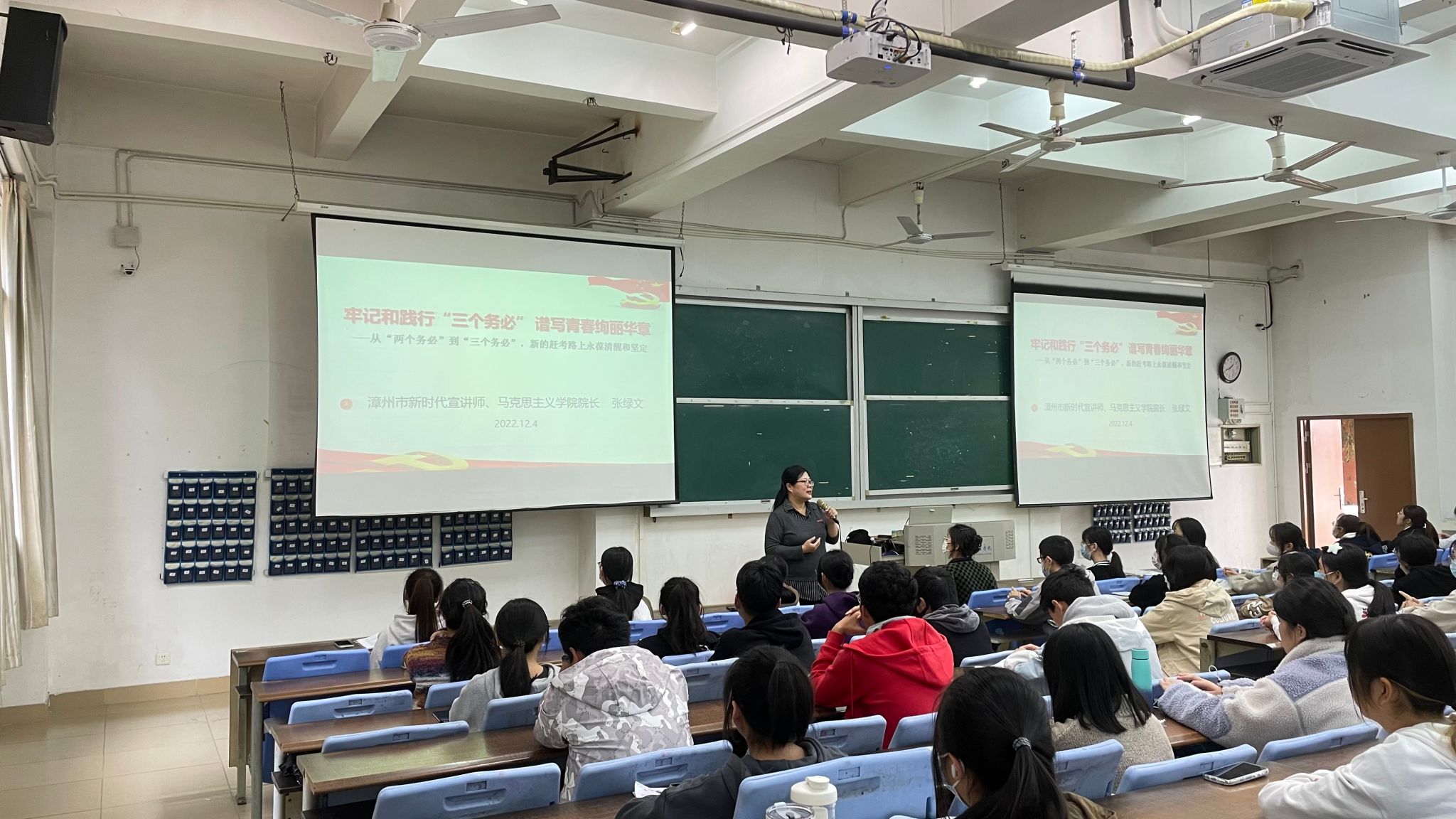 此外,结合今年开展“学习宣传贯彻党的二十大精神 推动全面贯彻实施宪法”的主题,漳州市新时代宣讲师、马克思主义学院院长、社团指导老师张绿文以牢记和践行“三个务必” 谱写青春绚丽华章为题开展宣讲活动。
