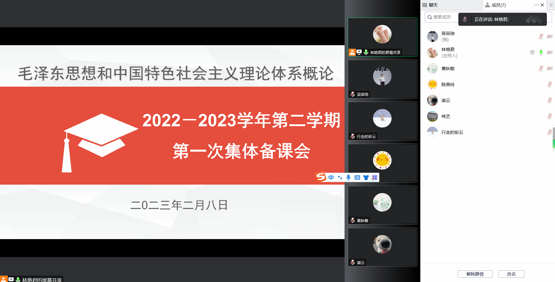 集体备课活动由各教研室主任主持,参与上课的教师全体参加。采用腾讯会议或线下集中研讨的形式进行。毛泽东思想和中国特色社会主义理论体系概论教研室采用腾讯会议的形式就2023版与2021版教材的增减内容进行集中学习,讨论确定了课程的教学进度表、实践课方案以及考核方法,并安排每章节集体备课的责任教师,提高课程的教学质量。