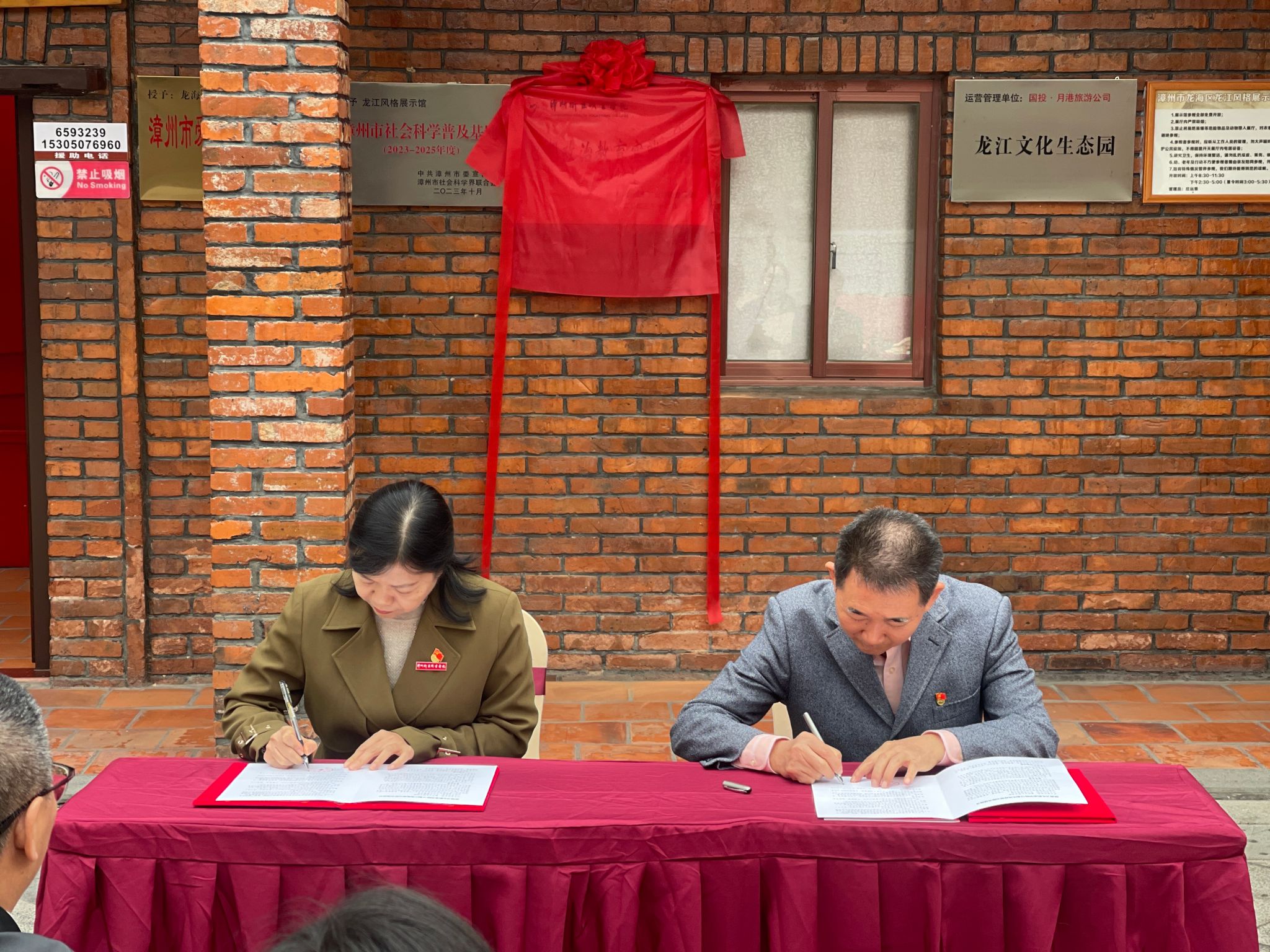 为深入学习贯彻习近平总书记关于“大思政课”的重要指示批示精神,推动主题教育走深走实,用好漳州红色“大资源”、建设思政“大课堂”、构建育人“大格局”,12月6日上午,学校与龙江风格展示馆合作共建思想政治教育实践基地,签约揭牌仪式在龙江风格展示馆隆重举行。我校马克思主义学院院长洪玉兰、龙海区委组织部部务会成员、区委党校常务副校长林志良、副校长林国平、龙江风格展示馆馆长、龙江精神研究会会长林兆明出席仪式,我校思政课教师代表、青马学社和读书社学生代表参加仪式。