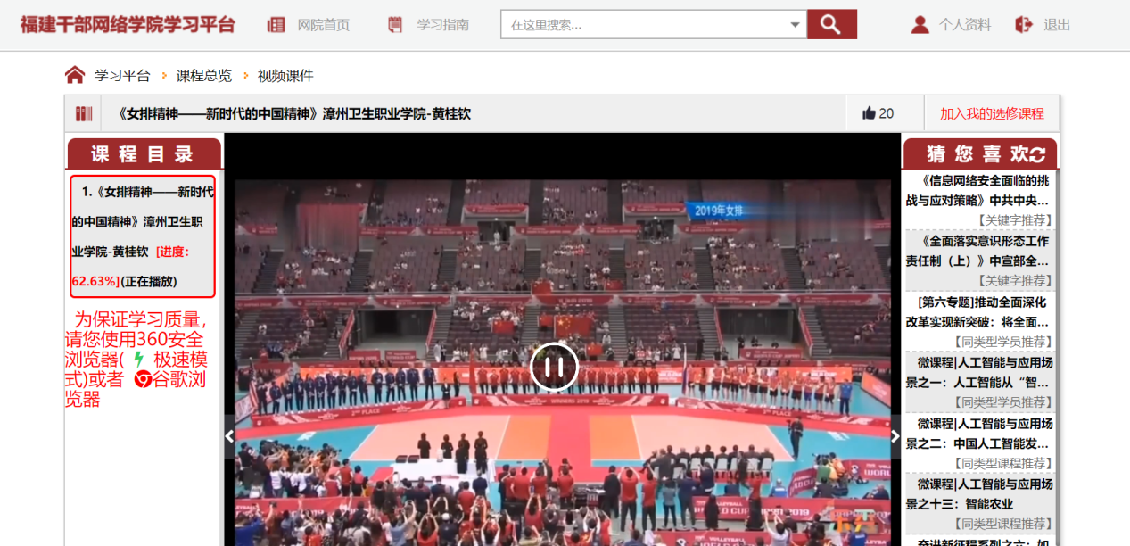 近日,从福建干部网络学院教学平台获悉,马克思主义学院黄桂钦老师录制的教育教学改革视频“女排精神—新时代的中国精神”被推至福建干部网络学院教学平台展播,栏目名称为“强化政治监督,推进思政课上新水平”成果展播。