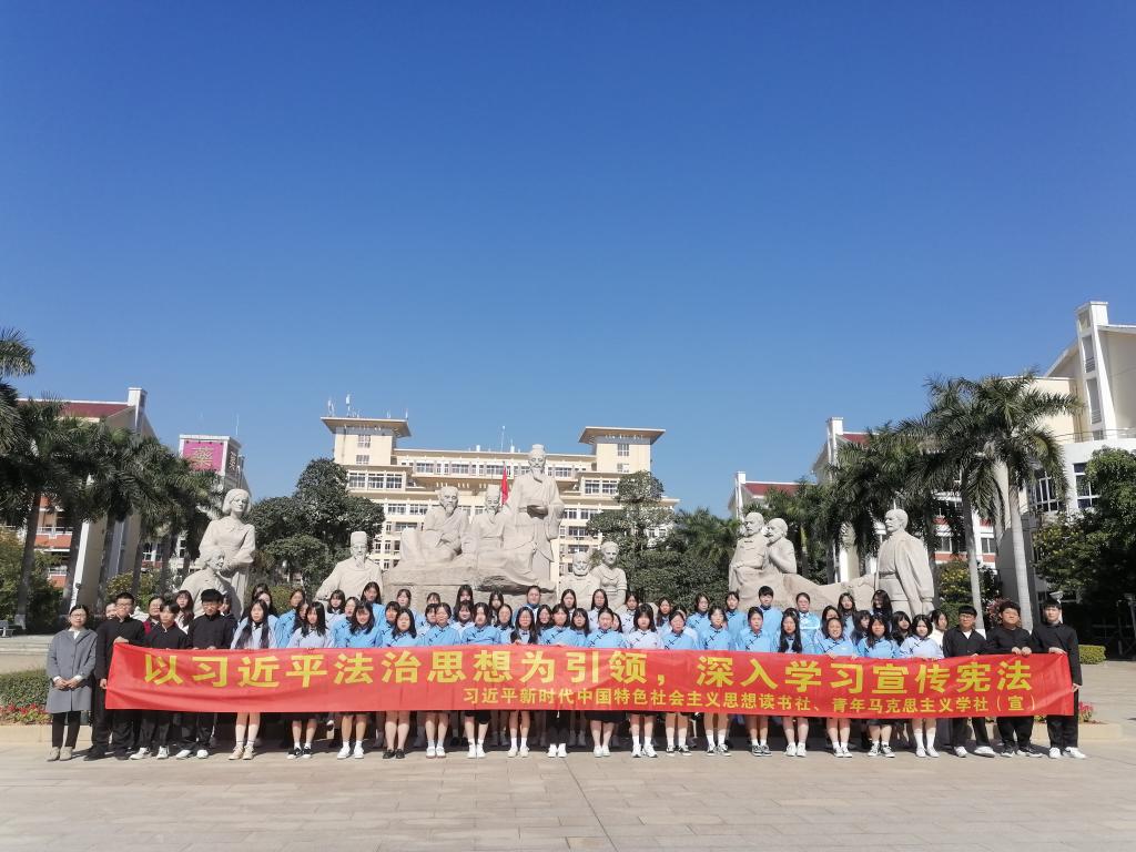 12月4日国家宪法日当天,在校园雕塑群前,社员与教师代表手拉横幅,表达坚定宪法自信,增强宪法自觉的决心。当天晚上,在黄金时段社员们收看“宪法的精神法治的力量——2021年度法治人物”特别节目。