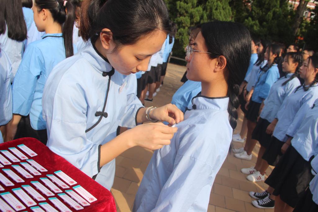 在纪念碑前,学社社长及副社长为新社员佩戴社徽,全体新社员面向鲜艳的社旗、党旗庄严而神圣地宣誓。铿锵有力的宣誓声感染了