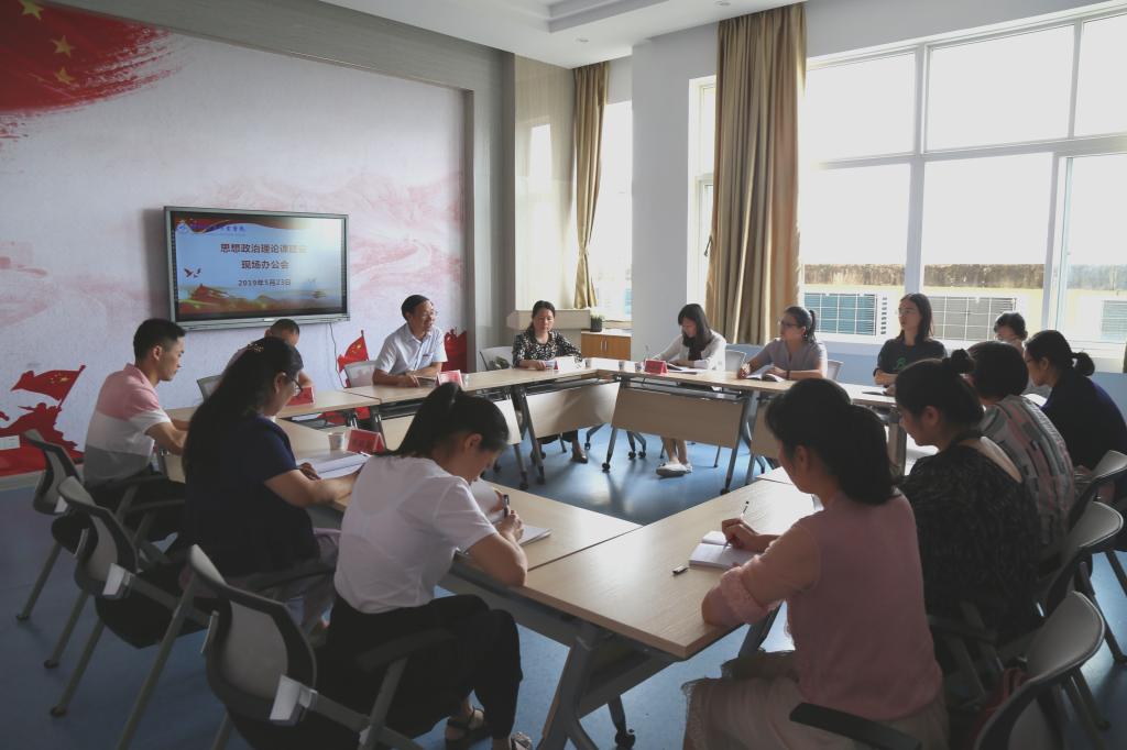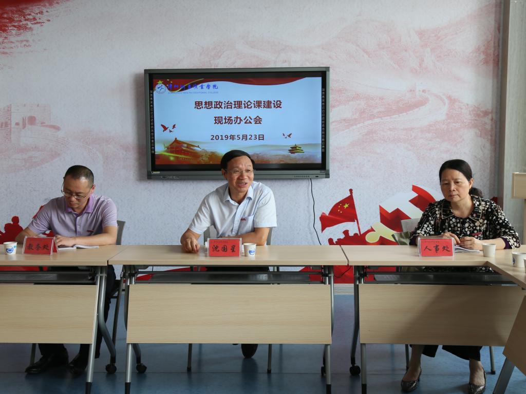 为深入贯彻落实全国高校思想政治工作会议、全国教育大会、学校思政课教师座谈会等会议精神,切实推进学院思政课建设工作,5月23日上午,学院院长沈国星带队到思政部召开思政课建设现场办公会,人事处、教务处、办公室、科研科等职能部门负责人、思政课教师代表参加会议。