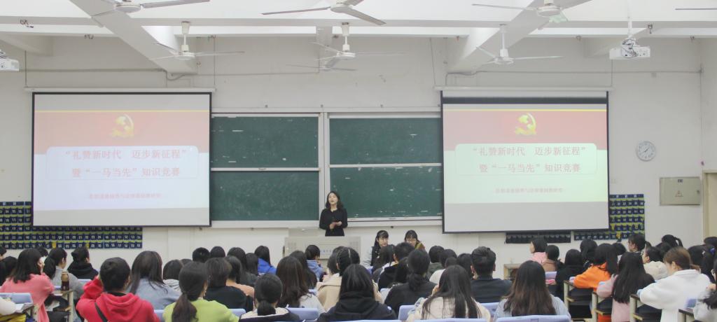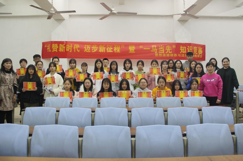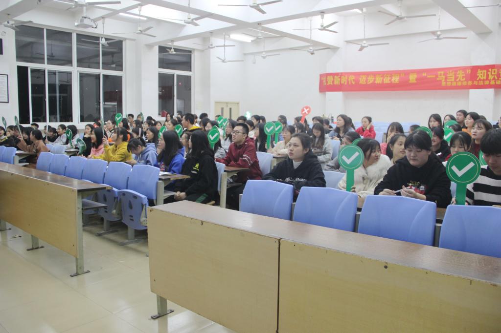 2019年12月31日晚上,由思政部主办、思想道德修养与法律基础教研室承办的”礼赞新时代 迈步新征程”暨“一‘马’当先”知识竞赛(思修专场)在明德楼2教举行,思修教研室主任、任课教师和青马学社、读书社学生干部及进入知识竞赛专场的学生参加。