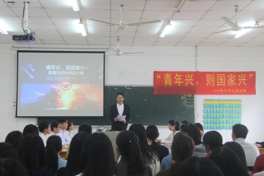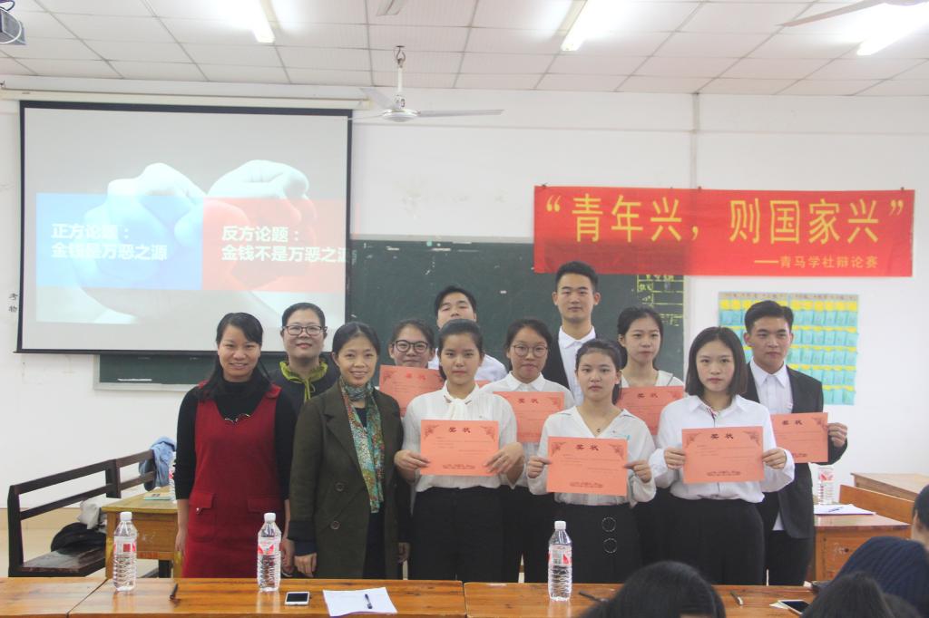 11月26日下午,由院青马学社举办的以“金钱是不是万恶之源”为辩题的辩论赛决赛在致远楼503进行。院青马学社指导老师、院学生会及其它社团负责人共7人担任本次活动评委,院青马80余位社员到场观看。