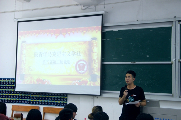 4月10日下午,院青年马克思主义学社在明德楼102教举办青年马克思主义学社第五届干部竞选会。此次参与竞选的共有21名候选人,思政部指导老师、青马学社及院部分社团负责人共同担任评委。