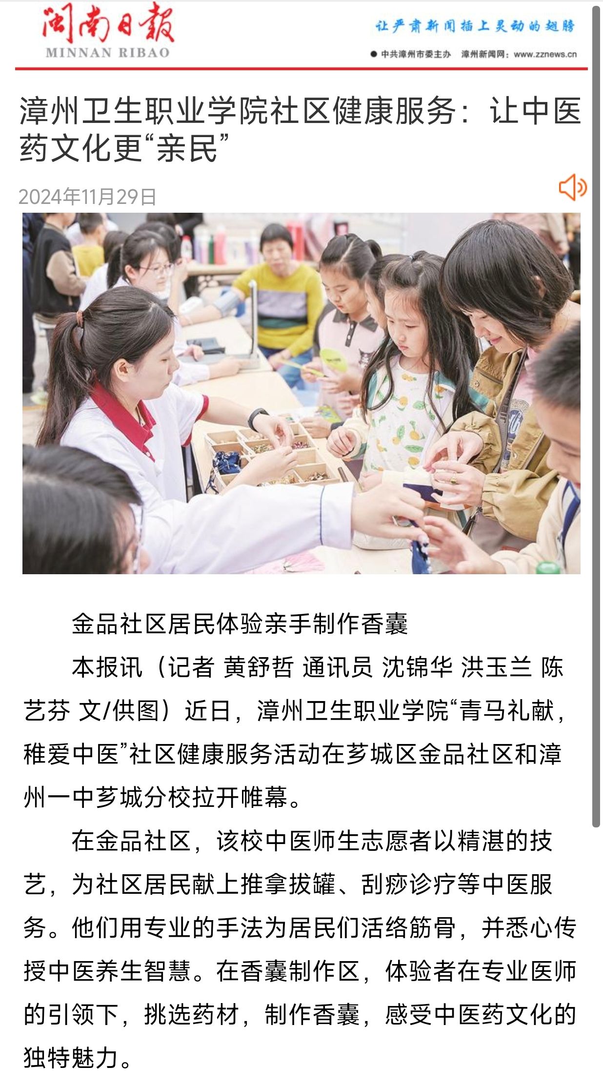 闽南日报:漳州卫生职业学院社区健康服务:让中医药文化更“亲民”