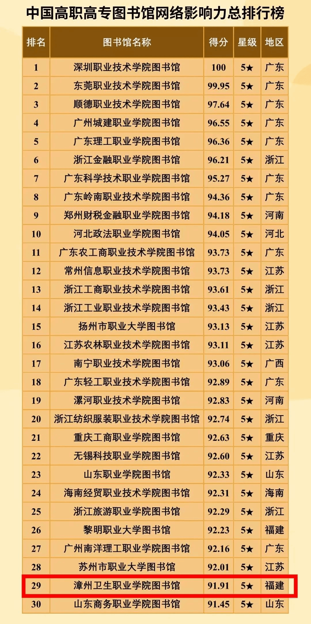 近日,“中国图书馆网络影响力评价报告(2023-2024)”于第十四届全国科学计量学与科教评价研讨会现场正式发布。我校图书馆在“中国高职高专图书馆网络影响力总排行榜”(1489所专科院校图书馆参评)评分91.91,位列福建省高职高专图书馆第2名、全国高职高专图书馆第29名。
