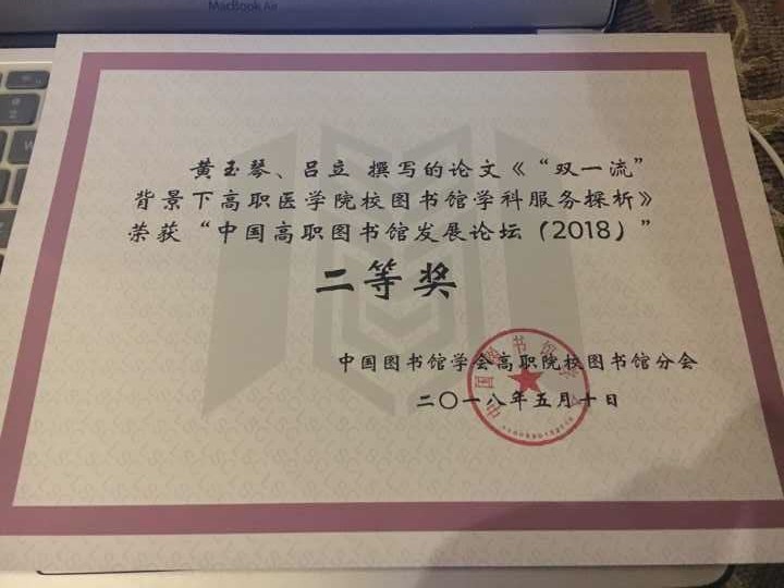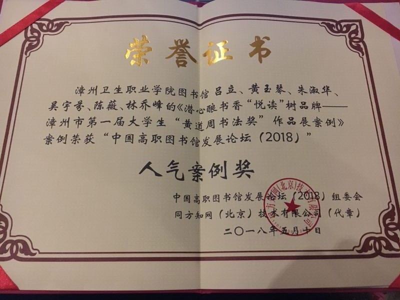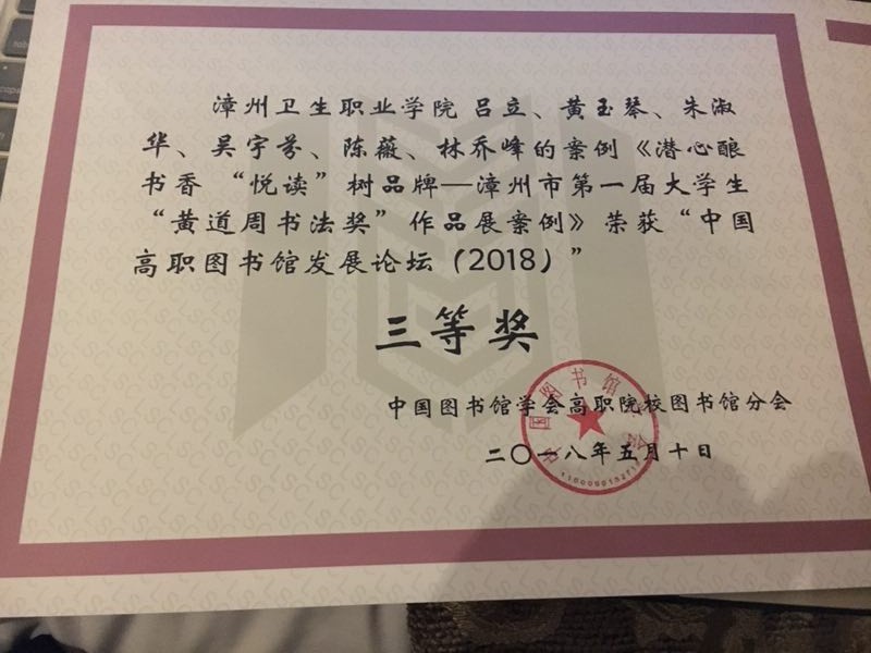近日,由中国图书馆学会高职院校图书馆分会举办的中国高职图书馆发展论坛(2018)在安徽省合肥市圆满落幕。本次论坛以“新时代•新目标•新作为”为主题,以高职院校图书馆助力“优质校”建设为方向。我院图书馆首次参赛,受到评审专家的肯定,成绩骄人,从129个入围案例、244篇参评论文中脱颖而出,斩获三个奖项。其中,提交的论文《“双一流”背景下高职医学院校图书馆学科服务探析》荣获二等奖、案例《潜心酿书香“悦读”树品牌 ——“黄道周奖”漳州市第一届大学生书法作品展》荣获三等奖、人气案例奖。
