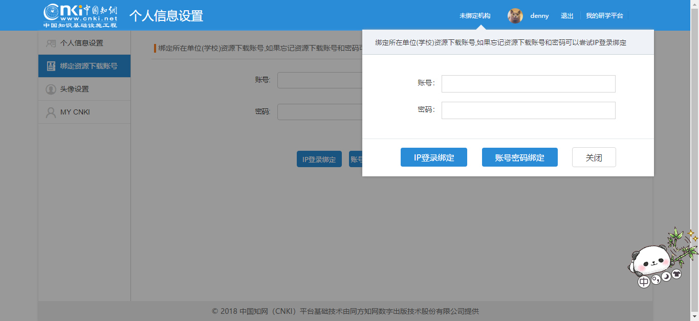 2、机构账号绑定:如果IP无法自动识别,请输入机构账号密码进行绑定操作。关于机构账号密码,可以咨询图书馆朱老师 2559601。
