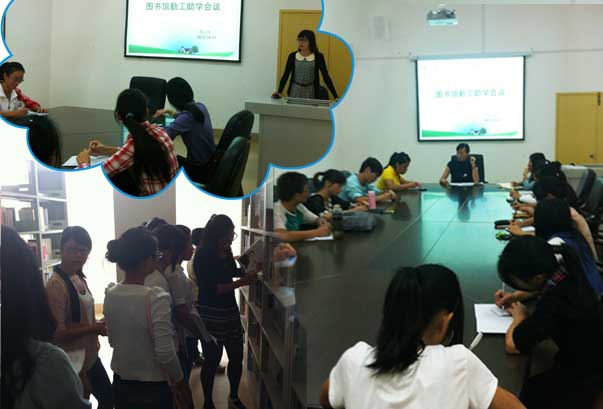 会议由馆办黄玉琴老师负责主持。在会上,吕副馆长对勤工助学的同学利用课余时间到图书馆工作表示欢迎和感谢。她说,在图书馆勤工助学,虽然有微薄的收入,但更多的是劳动和奉献,学习服务与管理,为今后走进社会积累经验!她提出三点希望:1、学会处理学习和工作的矛盾。要有较强的组织纪律性;2、尽快掌握图书馆业务知识。以主人翁意识、热情周到服务读者;3、要学会引导学生利用图书馆。期间,馆办黄玉琴、流通科阮慧玲、期刊阅览室杨海娟分别对同学们进行各部门工作的岗前培训。
