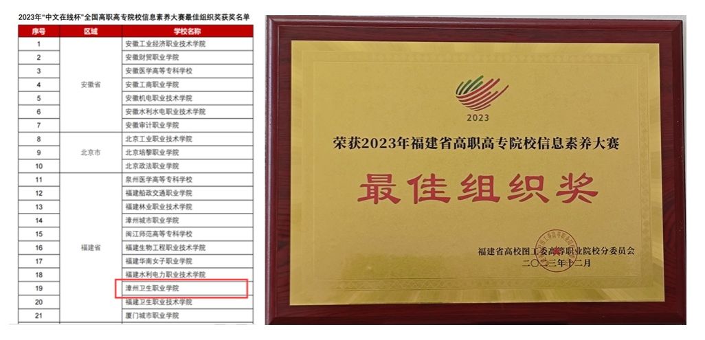 近日,福建省高校图工委高等职业院校分委员会2023年度工作总结暨福建省高职高专院校信息素养大赛表彰会落下帷幕,我校获评2023年全国高职高专院校信息素养大赛“最佳组织奖”、福建省高职高专院校信息素养大赛“最佳组织奖”。