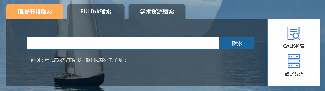 其一,“资源检索”模块。重新设计检索区,在原有检索功能基础上,增加了集成式资源检索模块,实现通过一个检索平台对馆内文献资源的一站式检索,在提供“馆藏书刊检索”的同时,还为大家准备了“FULink检索”、“学术资源检索”、“CALIS检索”等更多共建共享资源和常用数据库检索功能,方便大家获取想要的馆藏资源。