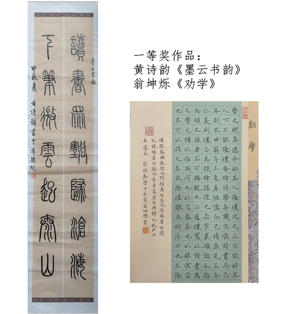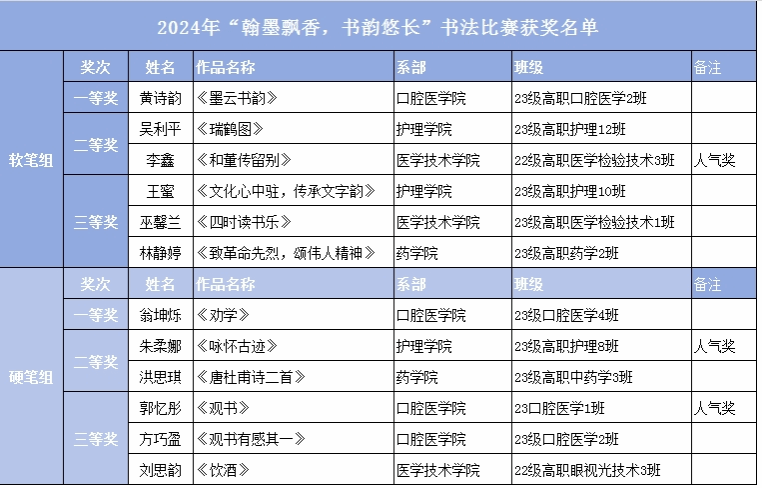 “杏林书香,九秩芳华”2024年漳州卫生职业学院图书馆阅读文化活动之五——“翰墨飘香,书韵悠长”书法比赛,于近日圆满结束。此次活动,受到了读者的广泛关注和踊跃参与,共收到书法作品近50幅。经过初评,12幅优秀作品脱颖而出,进入线上投票环节。最终,结合专业评审意见以及票选结果,评选出一等奖1名,二等奖2名,三等奖3名,人气奖3名。其中,23级口腔医学院口腔医学二班黄诗韵同学作品《墨云书韵》、23级口腔医学院口腔医学四班翁坤烁同学作品《劝学》分别荣获软笔组、硬笔组一等奖。