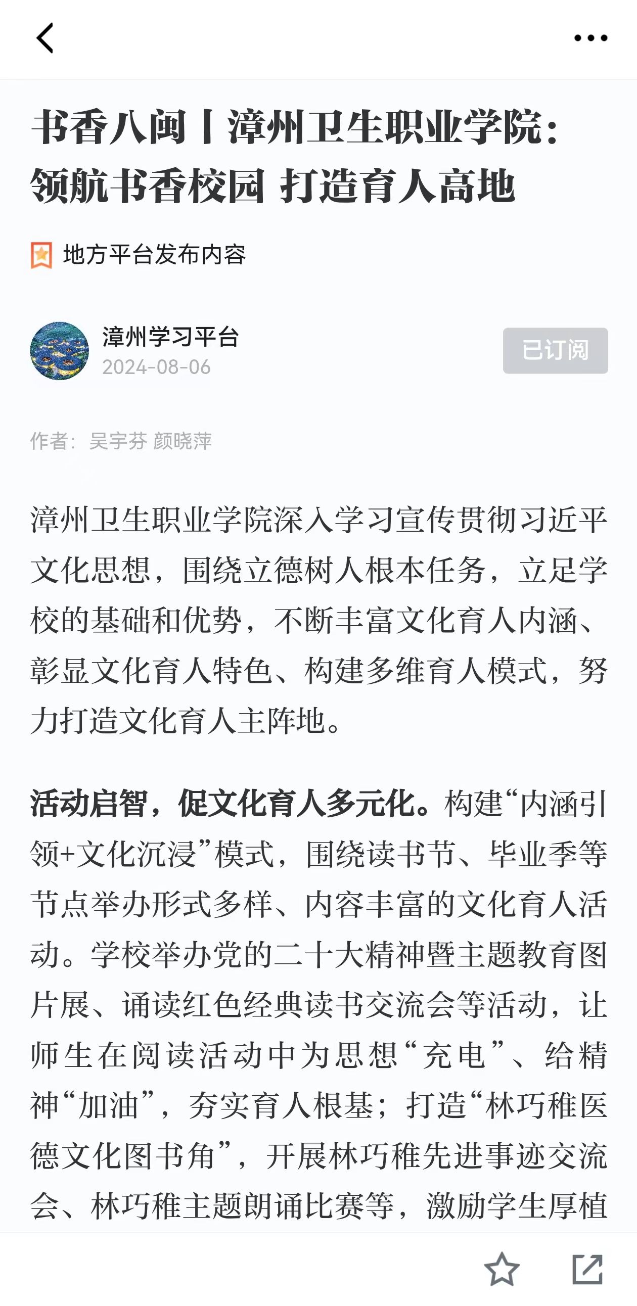 学习强国:书香八闽丨漳州卫生职业学院:领航书香校园 打造育人高地
