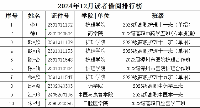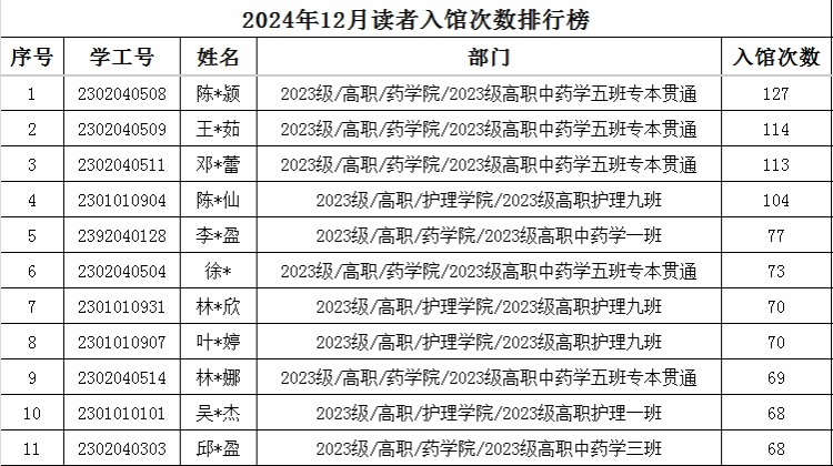 2024年12月学生读者借阅册数排行榜和入馆次数排行榜榜单如下: