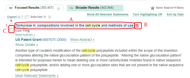 2. 检索结果会显示作者摘要等基本信息,单击所需文章名称即可在线阅读(A),点击文章后的PDF图标(B)即可下载,点击C处文件夹图标可收藏文章到自己账号