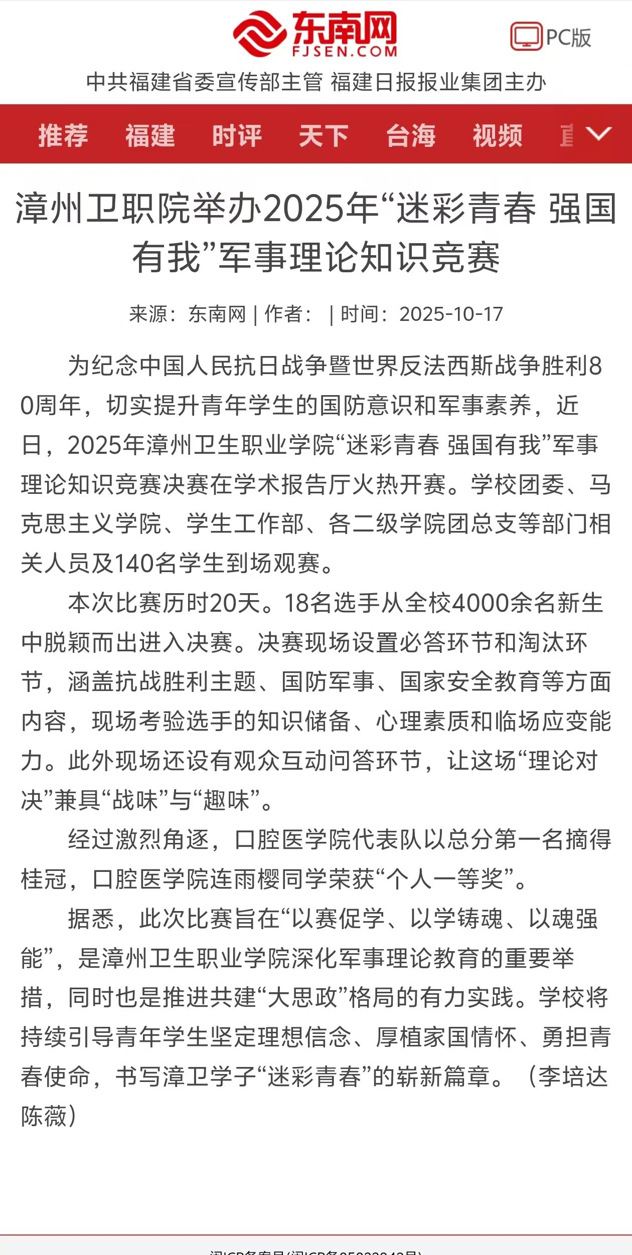 东南网:漳州卫职院举办2025年“迷彩青春 强国有我”军事理论知识竞赛