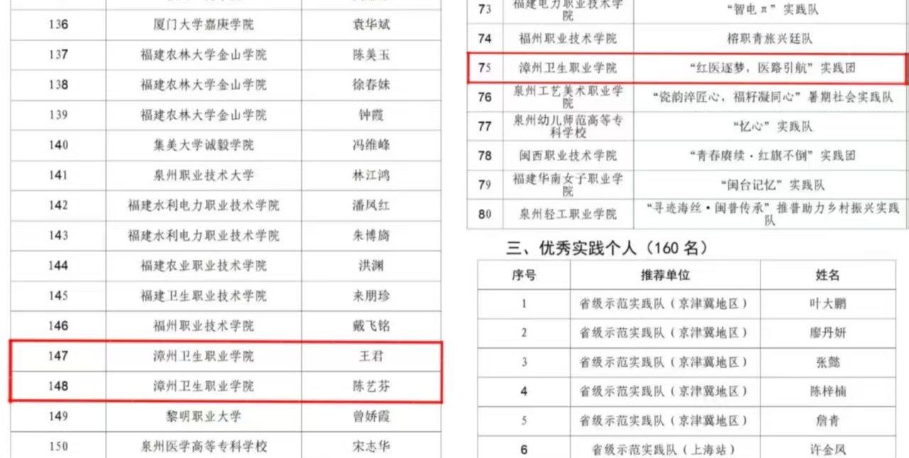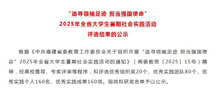 近日,由中共福建省委教育工委组织开展的“追寻领袖足迹 担当强国使命”2025年全省大学生暑期社会实践活动评选结果公布。我校“红医逐梦,医路引航”实践团获评“优秀实践团队”,王君、陈艺芬两名带队老师获评“优秀实践个人”。