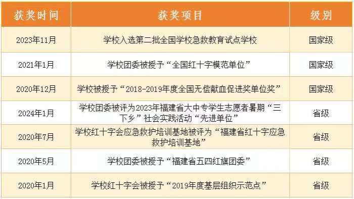 构建“五措八径”育人红十字文化体系。开展校内外应急救护知识公众普及活动200余场,实现公众普及2.5万人次;组织培训近6500名学员获AHA证书、救护员证书和应急救护师资证书;学校入选第二批全国学校急救教育试点学校,4次获得中国红十字会主题知识竞赛“单位组织一等奖”,2次获得福建省红十字应急救护大赛“团体二等奖”。长期致力于“三献”宣传工作,组织师生总献血量近75万毫升;10余名师生加入中华骨髓库;累计接收14名社会人士的遗体器官捐献。