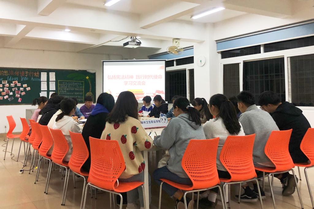 12月4日晚上,团委以“弘扬宪法精神,推进国家治理体系和治理能力现代化”为主题,在学生素质发展中心一楼团学会议室开展团学干部学习交流会。