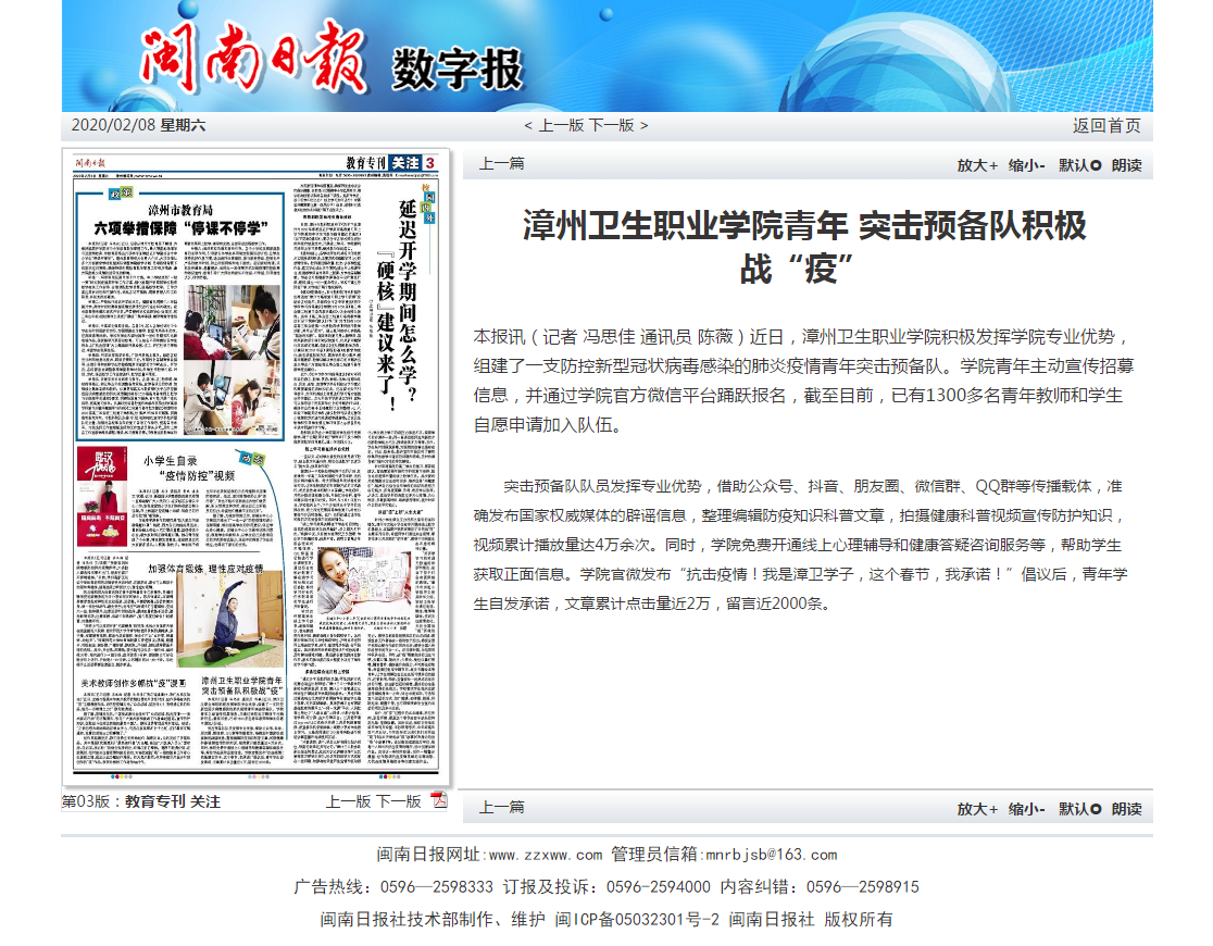 2020年2月8日,《闽南日报》第03版发表题为《漳州卫生职业学院青年突击预备队积极战“疫”》,报道了我院返乡大学生在疫情防控工作中的表现。报道全文如下: