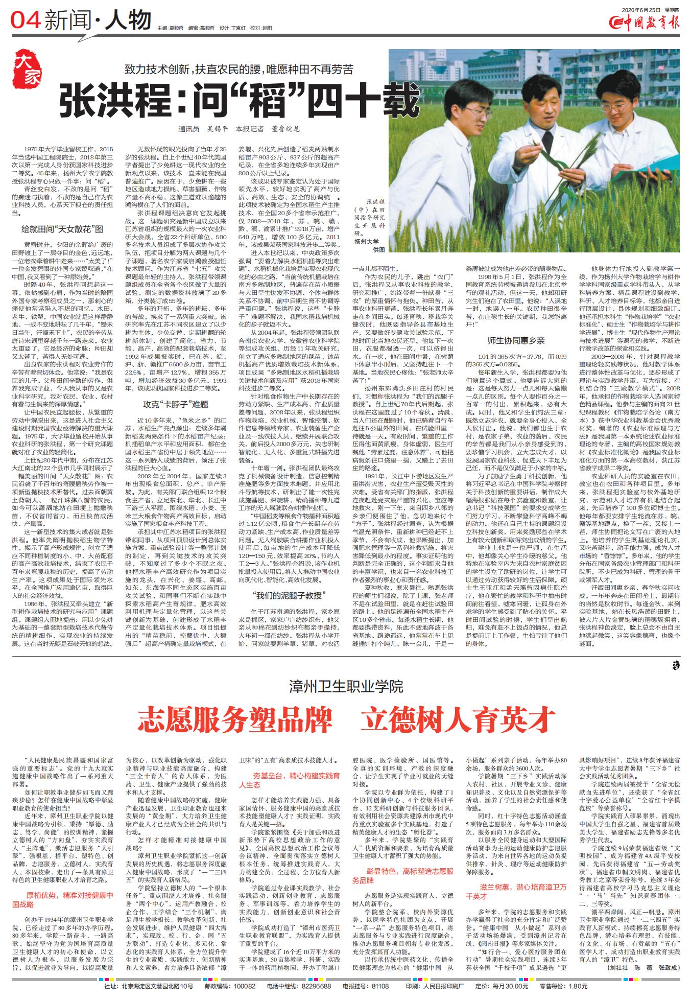 2020年6月25日,《中国教育报》发表题为《漳州卫生职业学院:志愿服务塑品牌 立德树人育英才》文章。报道全文如下:
