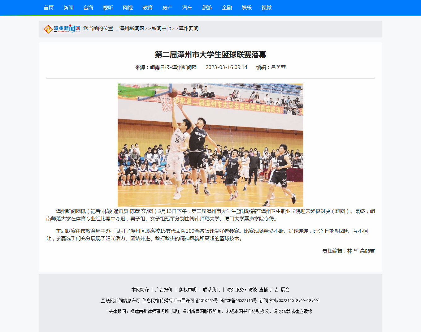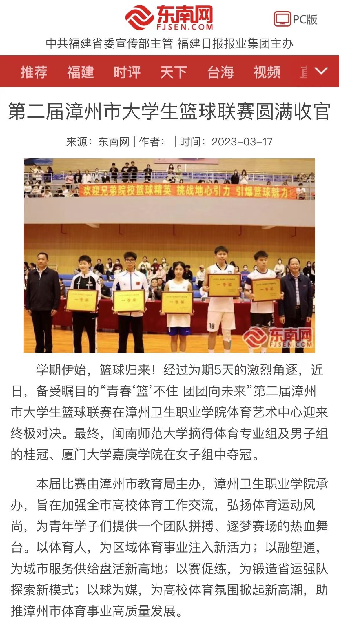 东南网、漳州新闻网、闽南日报:第二届漳州市大学生篮球联赛落幕