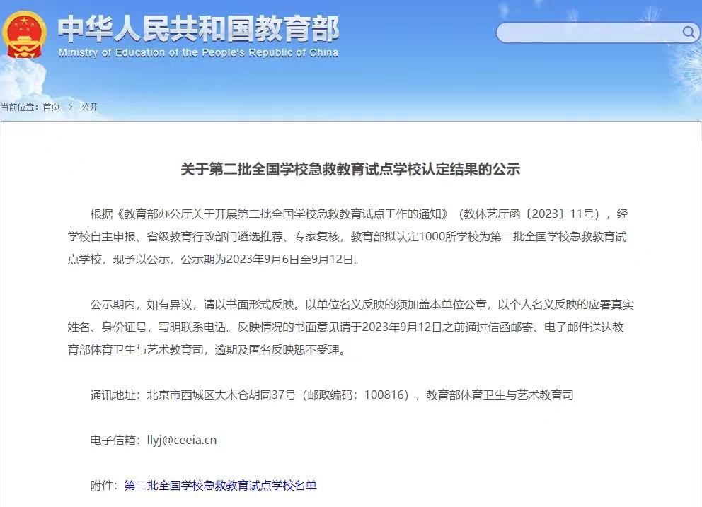 近日,教育部公布了第二批全国学校急救教育试点学校名单,我校成功入选。