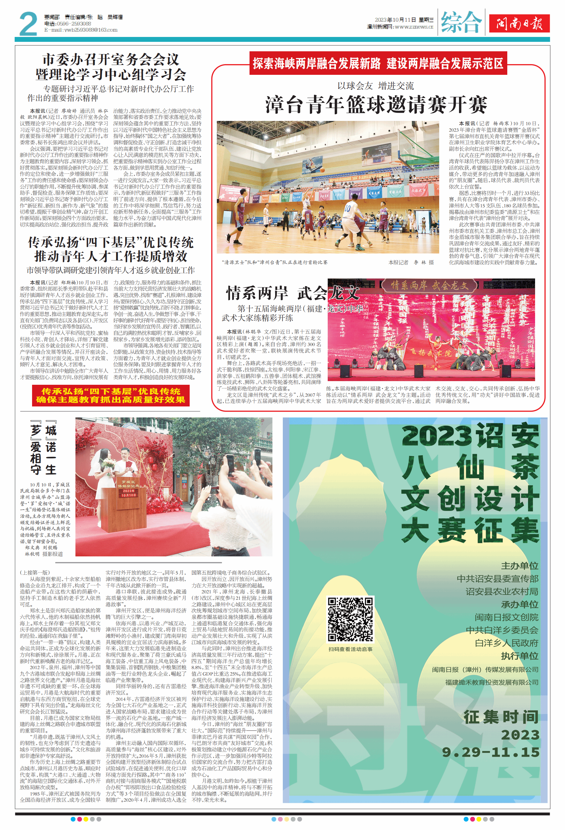 10月10日,2023年漳台青年篮球邀请赛暨“金盾杯”第七届漳州市直机关青年篮球赛开赛仪式在漳州卫生职业学院体育艺术中心举办。副市长余向红出席开赛仪式。比赛将历时一个月,进行33场比赛,共有在漳台湾青年代表漳州市委办、漳州市人大等15支队伍、180名球员参加。揭幕战由漳州市纪委监委“清源卫士”和在漳台湾青年代表“漳州台青”展开对决。此次赛事旨在持续巩固漳台青年交流成果,引领广大漳台青年在现代化滨海城市建设的实践中贡献青春力量。