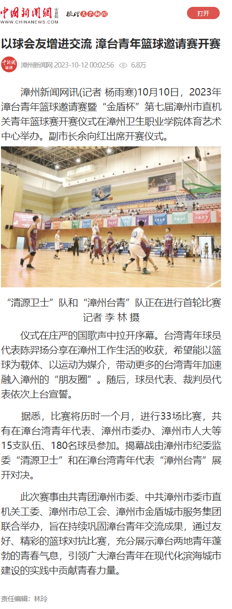 中国新闻网:以球会友增进交流 漳台青年篮球邀请赛开赛