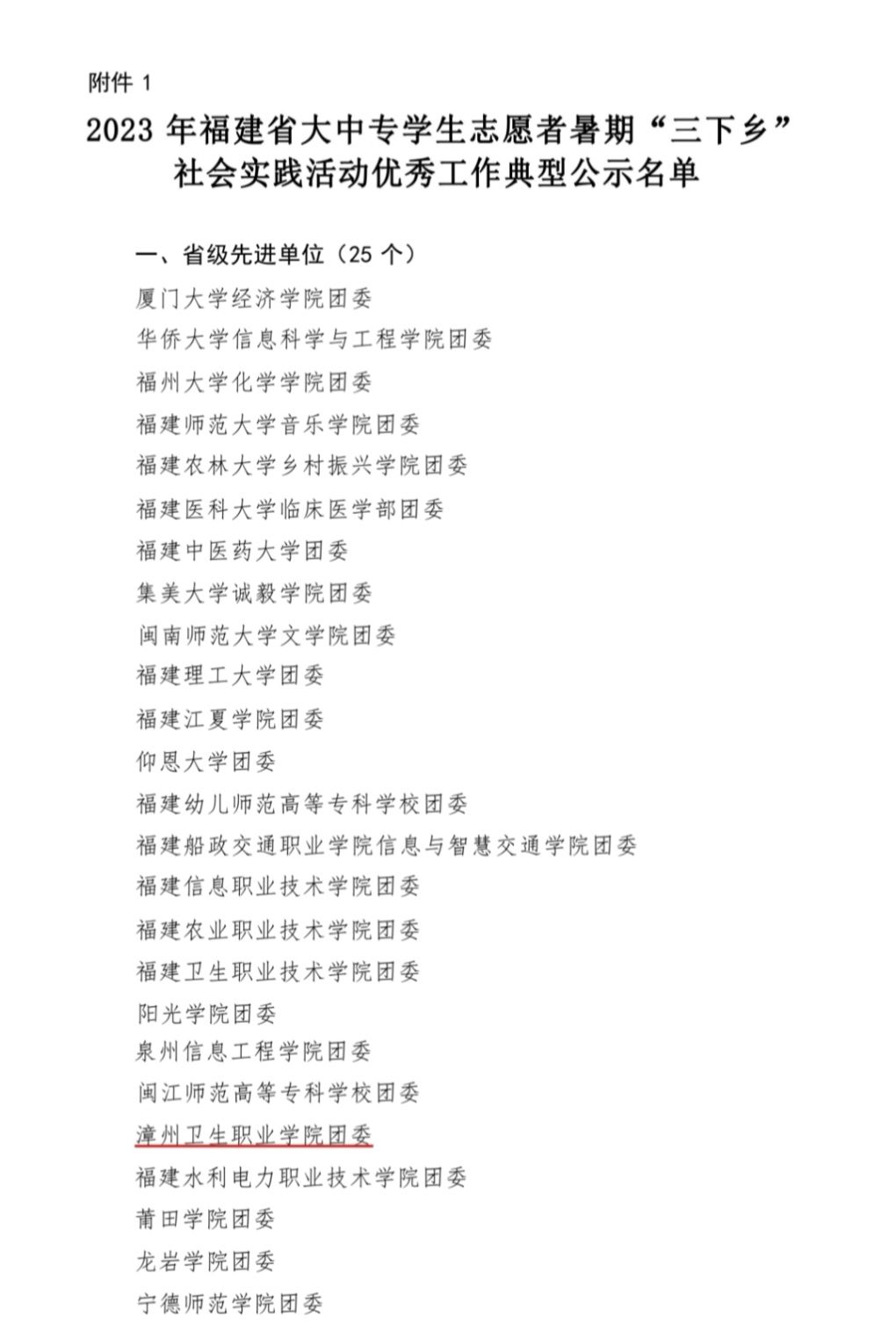 近日,共青团福建省委办公室公布了2023年福建省大中专学生志愿者暑期“三下乡”社会实践系列活动评选结果。我校团委荣获“先进单位”,临床医学院团总支书记王君荣获“先进工作者”,护理学院2022级漳州市医院合作班学生林钰珍荣获“先进个人”,中医与康复学院辅导员张金连受聘第三批“校园河长”。