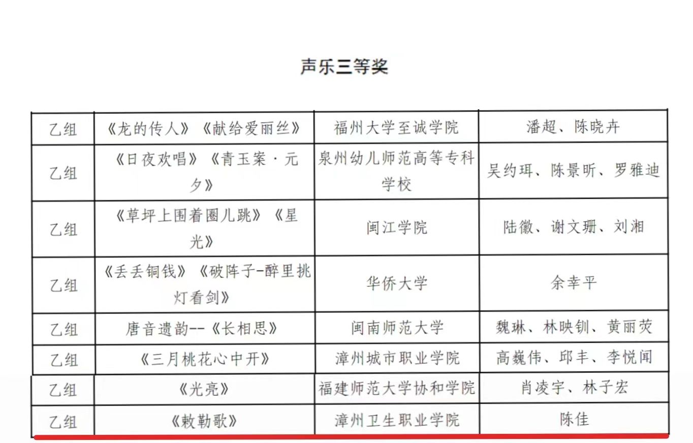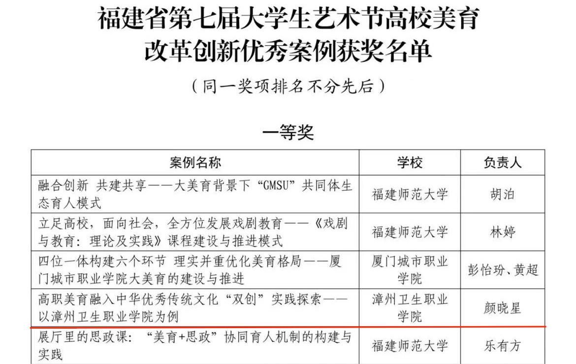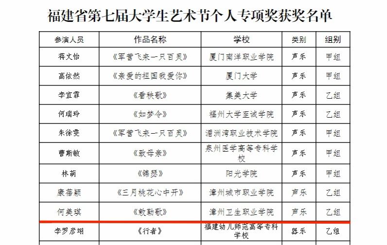福建省第七届大学生艺术节展演活动获奖名单近日公布。活动由福建省教育厅主办,三年举办一次,本届以“厚植家国情怀,涵养进取品格”为主题。我校精心准备,选送美育案例《高职美育融入中华优秀传统文化“双创”实践探索》获评福建省第七届大学生艺术节“改革创新优秀案例”一等奖,并被推选参加全国第七届大学生艺术展演;作品《敕勒歌》获评“声乐三等奖”(乙组),何美琪同学获评“个人专项奖”。
