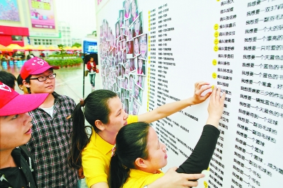 4日,在福州宝龙城市广场“青春志、我的中国梦”台江区青年公益社团梦想秀活动现场,青年志愿者在帮助一名盲人往“微心愿”墙上贴象征着心愿被认领的笑脸贴纸。