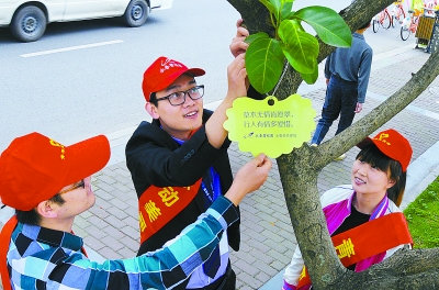 4日,永春县举行“挂树牌,爱永春”环境保护宣传活动,青年志愿者走上街头,为沿途树木挂上宣传环保、绿色理念的树牌。