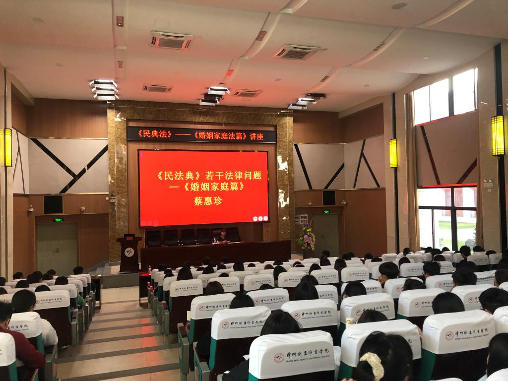 为深入学习宣传习近平法治思想,提高广大青年学生法治观念和法治意识,由市司法局、团市委、市教育局、市学联举办的“追梦青春 与法同行”《民法典》宣讲进高校活动,于12月6日下午在我院举办专场宣讲,漳州中级人民法院民一庭庭长、四级高级法官蔡惠珍在厚德楼学术报告厅开展《民法典》——婚姻家庭篇专题讲座。