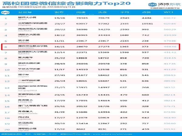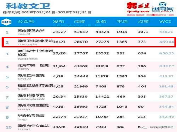 4月12日,闽南网公布了3月份漳州微信影响力榜单。我院官方微信平台在“科教文卫”的榜单中,荣登第二名。此外,在单篇文章中,我院更是以一篇温暖的文章《我有个妈妈,叫做“宿管阿姨”!》深受读者喜爱,赢得了9961的高阅读量,位居第一。同月,我院还登上了福建省高校团委微信综合影响力第6名。