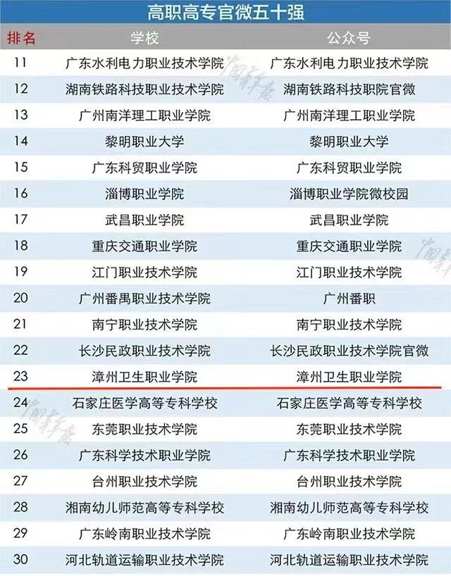8月15日,中国青年报揭晓了“2022-2023年度高职高专官微百强”年度排行榜,漳州卫生职业学院官微在全国1500余所高职高专院校中脱颖而出,位列第23名,在福建省高职高专官微中位列第2名!