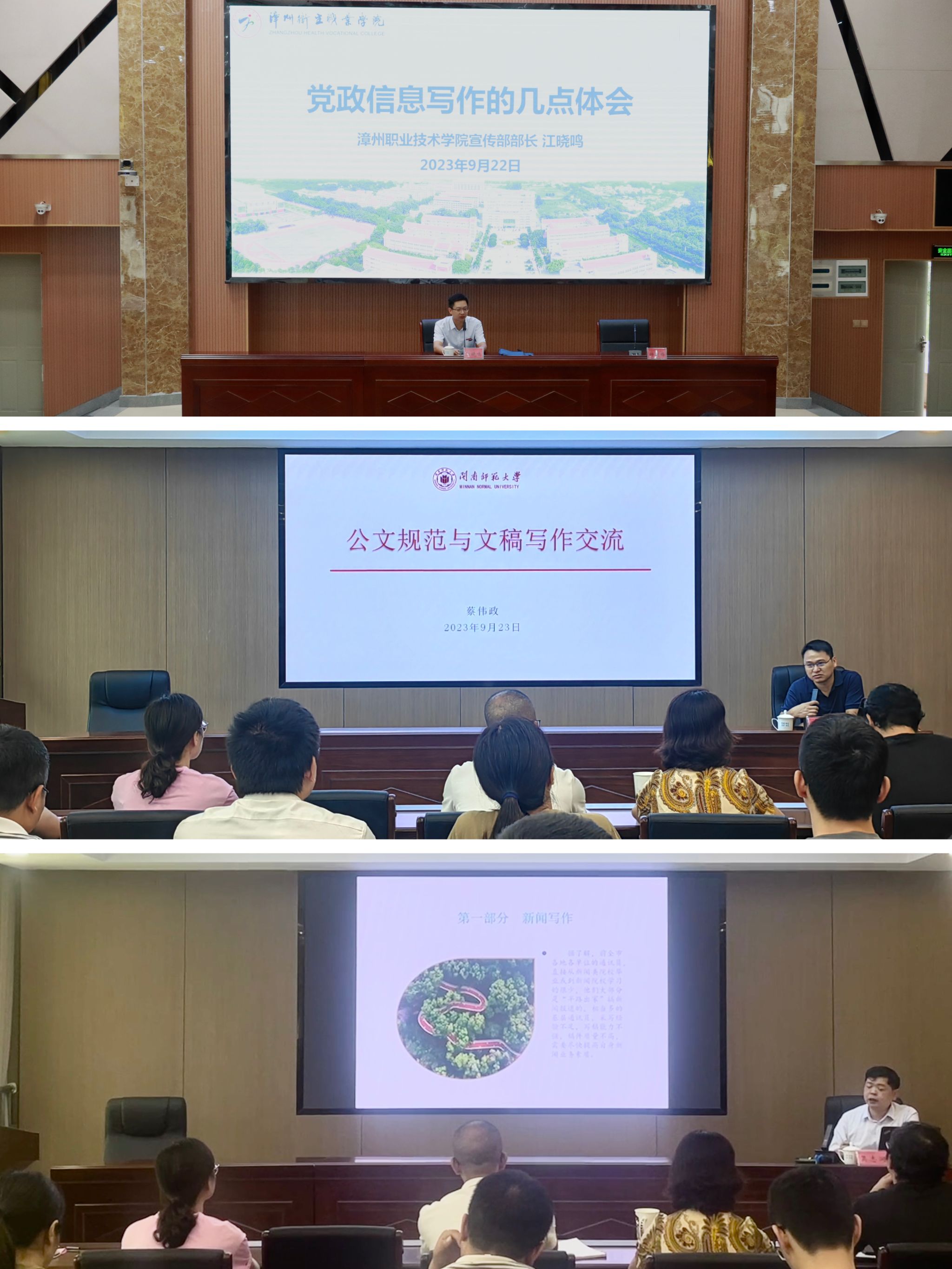 为深入学习贯彻习近平新时代中国特色社会主义思想,提高学校办文、办事、办会及信息宣传工作水平,服务和推进主题教育走深走实,9月22日—23日,我校举办2023年办公文秘与信息宣传培训班。校党委书记陈超出席开班式并作动员讲话,会议由副校长蔡韶滨主持。各部门党政负责人,二级学院办公室主任,各部门新闻信息员,党政办公室、宣传部及主题教育办全体成员等参加会议。