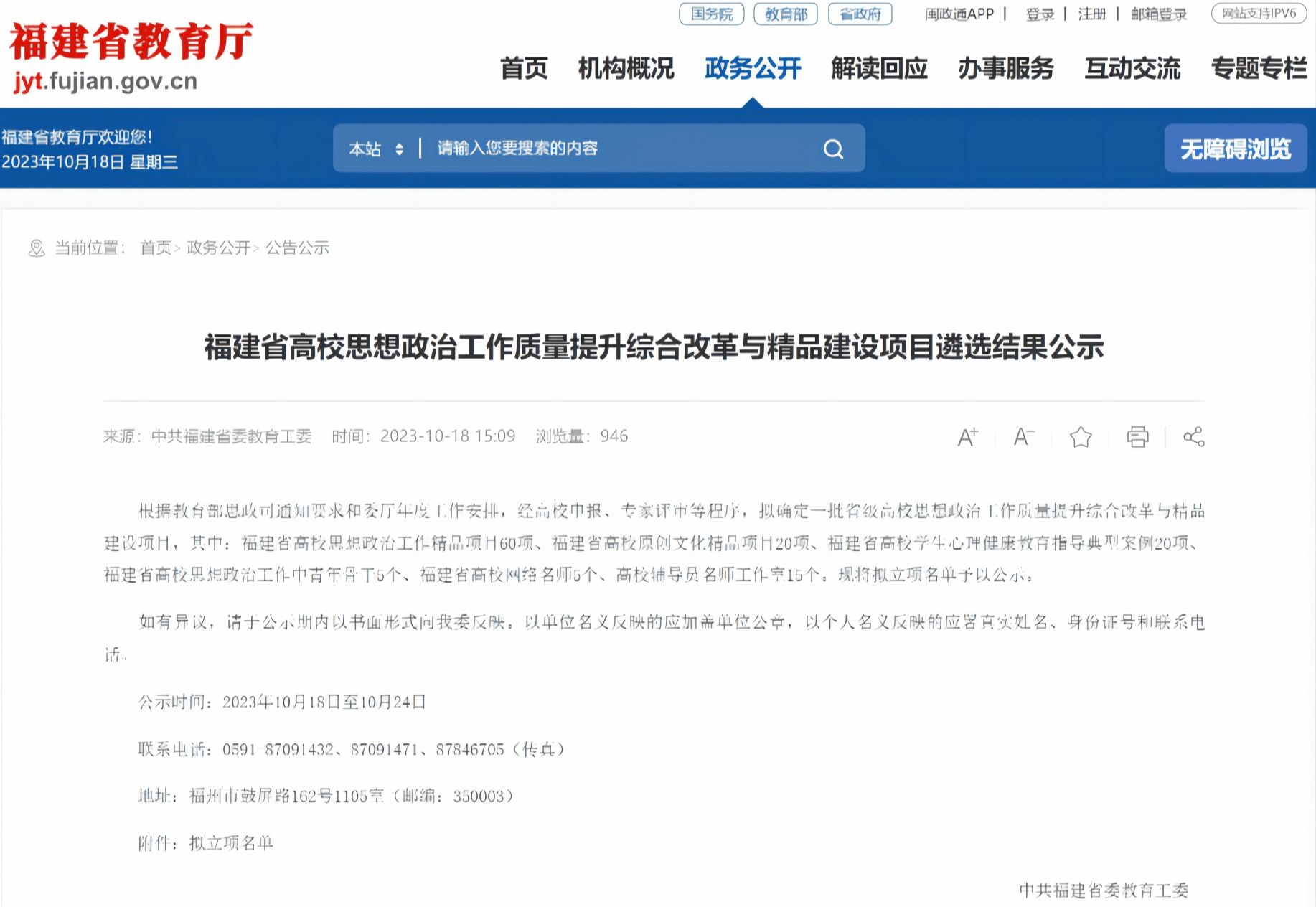 10月18日,中共福建省委教育工委公布省级高校思想政治工作质量提升综合改革与精品建设项目拟立项名单,我校共计3个项目入选。其中,《“六措四有”工匠精神实践育人的实践与探索》入选高校思想政治工作精品项目;《林巧稚》系列微电影入选高校原创文化精品;《打造心理“阳光”工程,驱散抑郁阴霾》入选高校学生心理健康教育指导典型案例。